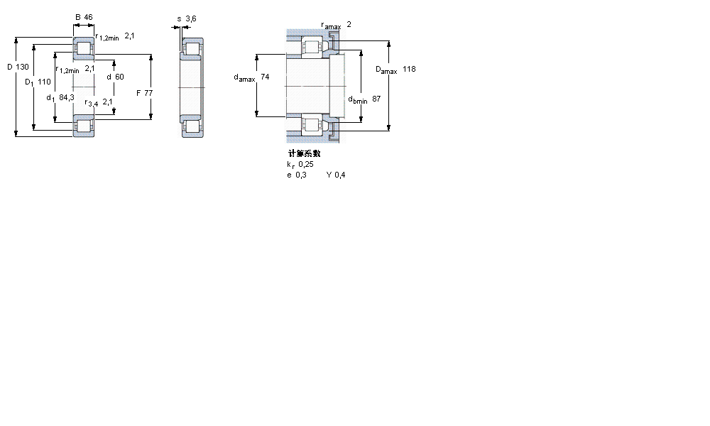 | 圓柱滾子軸承, 單列, NJ 設(shè)計, 于外圈的一個帶定位槽 | ||||||||||||
