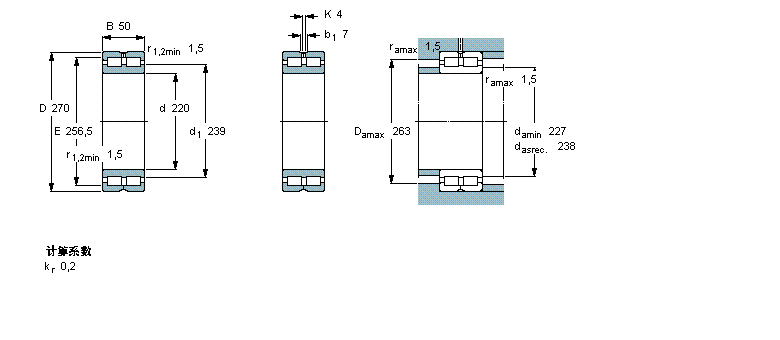 | 圓柱滾子軸承, 雙列滿裝滾子, 無密封件, 雙方向軸向負(fù)荷的擋邊 | ||||||||||