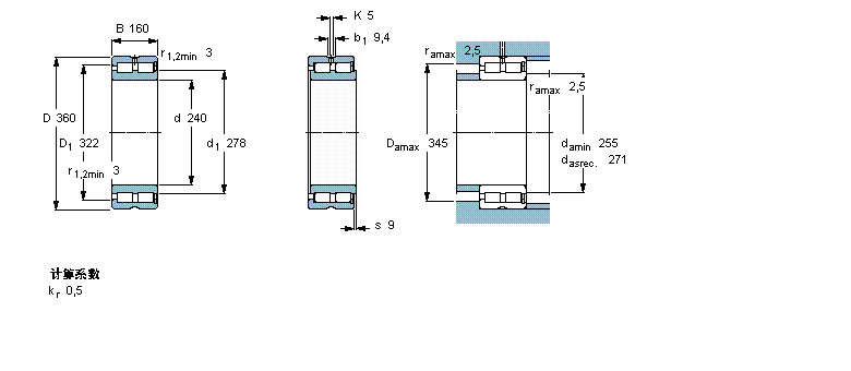 | 圓柱滾子軸承, 雙列滿裝滾子, 無密封件, 單方向軸向負荷的擋邊 | ||||||||||